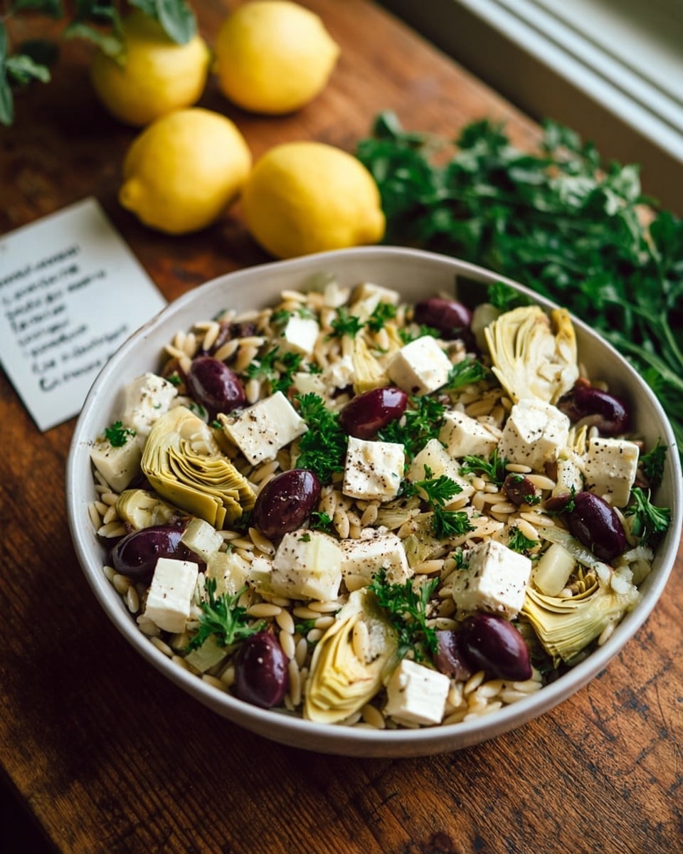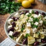 Keywords: Artichoke salad, Orzo salad, Mediterranean salad, Olive salad, Feta cheese salad, Lemon dressing, Easy pasta salad, Vegetarian salad