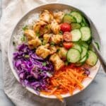 This Bang Bang Chicken Bowl recipe is a vibrant, flavorful dish featuring crispy pan-fried chicken tossed in a sweet and spicy sauce, served over jasmine rice with sautéed carrots and red cabbage, fresh cucumber, and a zesty lime drizzle. Perfect for a quick weeknight meal or meal prep, it combines a delightful balance of textures and bold flavors.