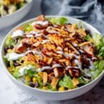 A flavorful BBQ Chicken Salad featuring tender sautéed chicken smothered in barbecue sauce, tossed with fresh romaine lettuce, corn, black beans, avocado, red bell pepper, shredded cheese, crunchy tortilla chips, and creamy ranch dressing for a delicious and hearty meal.