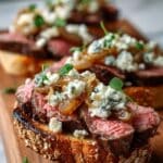 Delight in these elegant Beef Tenderloin Gorgonzola Crostini featuring tender roasted beef slices topped with creamy, tangy Gorgonzola cheese on toasted French baguette slices, finished with a touch of balsamic vinegar and fresh parsley garnish. Perfect as a sophisticated appetizer or savory snack.