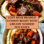 This Beer Braised Venison Roast with Carrots and Mashed Potatoes is a hearty and flavorful dish perfect for a cozy meal. Tender venison pieces are seared and slow-cooked in a rich brown ale and beef broth mixture infused with fresh herbs, garlic, and tomato paste, then served alongside creamy, buttery mashed potatoes and tender carrots.
