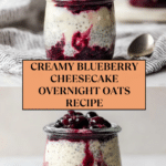 This Blueberry Cheesecake Overnight Oats recipe combines creamy cream cheese and Greek yogurt with the natural sweetness of blueberries and maple syrup. Mixed with rolled oats, chia seeds, and almond milk, it’s a nutritious and delicious make-ahead breakfast that requires no cooking.