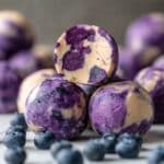The image shows round dessert balls with a marbled purple and beige color, indicating blueberry and creamy dough layers mixed together. There is one ball cut in half sitting on top, revealing a soft beige inside with deeply purple blueberry patches nestled within. The balls have a smooth, slightly glossy texture. Around the base, fresh blueberries are scattered, adding a natural touch. The background is blurred but filled with more of these purple and beige dessert balls set against a white marbled surface, creating a clean, appealing look. photo taken with an iphone --ar 4:5 --v 7