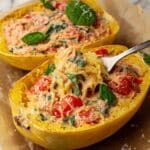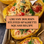 This Boursin Spaghetti Squash recipe combines the tender, naturally sweet strands of roasted spaghetti squash with a flavorful filling of juicy cherry tomatoes, fragrant garlic and shallots, and creamy, herbed Boursin cheese. Roasted to perfection and garnished with fresh basil, this delightful vegetarian dish serves as a comforting yet light main or side, perfect for showcasing seasonal produce with a sophisticated twist.