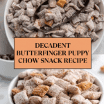 Butterfinger Puppy Chow is a delightful snack mix that combines the crunchy texture of rice Chex cereal with a luscious coating of melted milk chocolate, peanut butter, and butter, all enhanced by the sweet crunch of crushed Butterfinger candy bars. Finished with a generous dusting of powdered sugar, this treat is perfect for parties, movie nights, or anytime you crave a sweet, crunchy snack with a rich peanut buttery flavor.