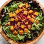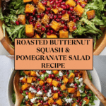 A vibrant and nutritious Butternut Squash and Pomegranate Salad featuring roasted butternut squash cubes, fresh pomegranate seeds, mixed greens, and creamy feta cheese, all tossed in a simple olive oil and balsamic vinegar dressing. This easy-to-make salad perfectly balances sweet, tangy, and savory flavors, making it an ideal healthy side dish or light meal.