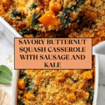 A hearty and flavorful Butternut Squash Casserole featuring a savory blend of sweet Italian sausage, kale, garlic, and fresh sage, topped with a golden, crispy parmesan panko breadcrumb crust and baked to perfection. This comforting dish combines tender butternut squash with robust sausage and aromatic herbs, making it a perfect side or main dish for fall and winter meals.