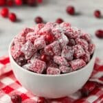 A white bowl filled to the top with small, square-shaped snack pieces that are bright red and coated in a light layer of white powder, creating a frosted look. Mixed within the squares are some whole, shiny red cranberries, adding texture and color contrast. The bowl rests on a red and white checkered cloth, placed on a white marbled surface, with some blurred red berries in the background. The overall colors are vibrant with red and white tones. photo taken with an iphone --ar 4:5 --v 7