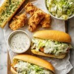 Two sandwiches sit on a wooden cutting board lined with white parchment paper, each made from a white sub roll that is split open and filled with three layers: a bottom layer of golden crispy fried chicken, topped with a thick layer of green lettuce creamy with dressing, and a final sprinkle of finely grated white cheese on top. Nearby are two extra pieces of the same crispy fried chicken with a crunchy, golden-brown texture. To the left of the sandwiches, there is a long piece of garlic bread with finely chopped green herbs spread on top. A small white bowl filled with thick, creamy white sauce with black pepper on top sits below the sandwiches. At the top right, a white bowl holds more of the same lettuce and dressing salad. The whole scene is set on a white marbled texture. Photo taken with an iphone --ar 4:5 --v 7