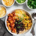 - Garnish and Serve: Top the bowls with chopped fresh cilantro and add any optional toppings such as sliced avocado, diced tomatoes, or a dollop of sour cream. Serve immediately with lime wedges on the side for squeezing.