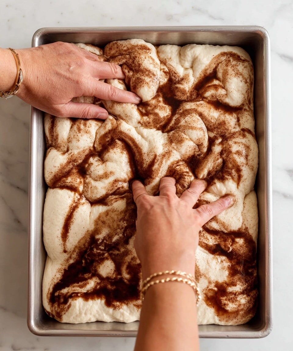 - Dimple the dough: Preheat your oven to 450℉. Once the dough has risen for the second time, use wet fingertips to press deep dimples all over the surface of the dough. Drizzle the cinnamon-butter mixture evenly over the dimpled dough.