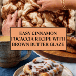 Keywords: Cinnamon Focaccia, cinnamon bread, sweet focaccia, Italian bread, browned butter, vanilla glaze