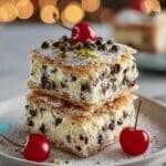 - Cool and Serve: Remove from the oven and let the cannoli squares cool for at least 30 minutes to set the filling. Once cooled, cut into squares and garnish with optional toppings like chopped pistachios, maraschino cherries, or extra chocolate chips if desired.