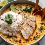 - Serve and garnish: Place cooked rice in bowls, ladle the hot coconut chicken broth over the rice, and top with sliced chicken. Garnish with chopped green onions, fresh cilantro, and lime wedges for a burst of fresh flavor and color.