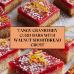 Cranberry Curd Bars with Walnut Shortbread Crust are a delightful dessert featuring a buttery walnut shortbread base topped with a smooth, tangy cranberry curd. Perfectly balanced between sweet and tart, these bars are finished with a dusting of powdered sugar and optional candied citrus zest for an elegant touch.