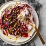 A close-up top view of a white plate with three layers: the bottom layer is smooth and creamy white, the middle layer is a thick, uneven dark red berry compote with bits of green chopped pistachios sprinkled on top, and the top layer is a mix of creamy white and berry red swirled together. A gold and dark wooden spreader rests on the plate, with a scoop of the mixed creamy and berry topping. The plate is placed on a white marbled surface next to a black and white striped cloth. photo taken with an iphone --ar 4:5 --v 7