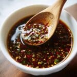 A white bowl holds a dark, shiny sauce filled with small bits of red chili flakes, yellow seeds, and tiny green herbs, giving it a textured look. A wooden spoon scoops some sauce, resting on the edge of the bowl with a visible woman’s hand holding the handle from above. The bowl is on a white marbled surface with soft natural light shining on the sauce, highlighting its glossy, slightly oily texture. photo taken with an iphone --ar 4:5 --v 7