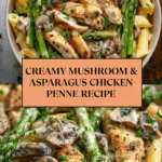 This Creamy Mushroom & Asparagus Chicken Penne is a comforting and flavorful pasta dish perfect for weeknight dinners. Tender chicken, fresh asparagus, and mushrooms come together in a rich, creamy sauce that coats every bite of penne pasta.