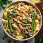 This Creamy Mushroom & Asparagus Chicken Penne is a comforting and flavorful pasta dish perfect for weeknight dinners. Tender chicken, fresh asparagus, and mushrooms come together in a rich, creamy sauce that coats every bite of penne pasta.