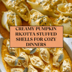 Creamy Pumpkin Ricotta Stuffed Shells are a cozy and delicious baked pasta dish featuring jumbo pasta shells filled with a creamy mixture of pumpkin puree, ricotta cheese, and aromatic spices. Topped with marinara sauce and melted mozzarella, this recipe is perfect for a comforting fall dinner.