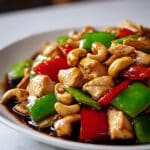 The dish is served on a white plate filled with a stir-fry of several layers. The bottom layer is a dark glossy sauce that coats the ingredients. On top, there are chunks of cooked chicken with a light brown, slightly shiny texture. Scattered among the chicken are large pieces of green and red bell peppers, adding bright color and a fresh, smooth texture. Lightly roasted cashew nuts sit evenly throughout the dish, adding contrast with their pale, matte finish. The whole dish looks freshly cooked and vibrant, placed on a white marbled texture surface. photo taken with an iphone --ar 4:5 --v 7