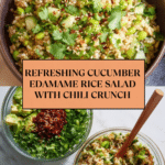A refreshing and nutritious Cucumber Edamame Rice Salad featuring perfectly cooked rice, fresh cucumber, creamy avocado, and protein-rich edamame, all tossed in a flavorful dressing made with soy sauce, toasted sesame oil, and a kick of chili crunch. Ideal for a light lunch or a vibrant side dish, this salad can be served warm or chilled.