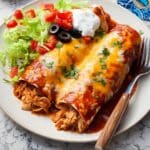 Keywords: chicken enchiladas, Mexican dinner, baked enchiladas, shredded chicken recipe, easy enchiladas, Monterey Jack cheese, red enchilada sauce