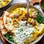 - Final Steps: Remove the dish from the oven and fluff the rice gently with a fork. Taste and adjust the seasoning if necessary. Serve the chicken and rice mixture topped with cool tzatziki sauce, sprinkle with fresh herbs like dill, basil, parsley, or chives, and add a squeeze of fresh lemon juice. Serve alongside warm pita bread for a complete meal.