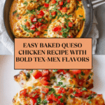 This Easy Baked Queso Chicken recipe offers a flavorful and cheesy dish featuring juicy marinated chicken breasts topped with a savory sautéed vegetable mix and creamy queso sauce. Perfectly seared then baked to golden perfection, this dish combines Mexican-inspired spices with the rich taste of melted cheese sauce, making it a simple yet impressive meal for any occasion.