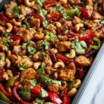 This Easy Sheet Pan Cashew Chicken is a flavorful and convenient weeknight dinner that combines tender marinated chicken, vibrant bell peppers, and crunchy cashews roasted to perfection on a single sheet pan. With a sweet and savory marinade featuring soy sauce, honey, garlic, and ginger, this recipe is simple to prepare, cooks quickly in the oven, and offers a delightful combination of textures and tastes in every bite.