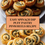 Easy Spinach Dip in Bite-Sized Pinwheels is a delicious appetizer featuring a creamy spinach and cheese filling rolled inside flaky puff pastry. Perfect for parties or snacks, these golden, savory pinwheels combine the richness of cream cheese, Parmesan, and flavorful spices baked to crispy perfection.