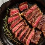 - Step 16: Slice steaks against the grain if desired, spoon the remaining butter-garlic mixture from the pan over the steaks, and serve immediately with your favorite sides.