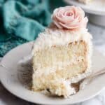 A slice of two-layer white cake sits on a white plate with a soft texture and creamy white frosting covering both layers and the top. The frosting is sprinkled with shredded coconut, adding a rough texture around the sides. On top of the cake slice, there is a delicate, pale pink rose made from frosting that stands out against the white. Next to the cake is an antique-style silver spoon with a small piece of cake on it. The plate is on a white marbled surface with a teal cloth blurred in the background. Photo taken with an iphone --ar 4:5 --v 7