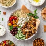 - Assemble the Bowls: In serving bowls, place a base of toasted pearl couscous. Layer with grilled Greek chicken pieces, tomato cucumber salad, crispy chickpeas, and a generous dollop of tzatziki sauce.