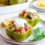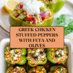 Keywords: Greek chicken stuffed peppers, baked stuffed peppers, healthy stuffed peppers, Mediterranean stuffed peppers, chicken and rice stuffed peppers, feta stuffed peppers