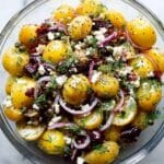 A refreshing Greek potato salad featuring tender baby yellow potatoes, tangy feta cheese, briny kalamata olives, and a zesty herb vinaigrette with fresh parsley and dill. Perfect as a side dish for summer gatherings or Mediterranean-inspired meals.