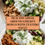 These Healthy Greek Ground Chicken Bowls are a vibrant and nutritious meal featuring seasoned ground chicken cooked with aromatic herbs, served over rice or cauliflower rice, and topped with refreshing Greek salsa and creamy coconut yogurt tzatziki. Perfect for a wholesome lunch or dinner with Mediterranean-inspired flavors.