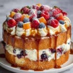 Heaven on Earth Cake is a luscious no-bake dessert featuring layers of airy angel food cake, fresh mixed berries, creamy vanilla pudding blended with sour cream, and a light whipped topping. This dreamy, easy-to-assemble trifle is perfect for summer gatherings or any occasion where a refreshing, fruity treat is desired. The dessert is finished with a drizzle of caramel or berry sauce and garnished with extra berries and whipped cream swirls for an elegant presentation.
