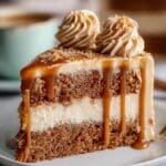 A close-up of a two-layer cake slice on a white plate, with a darker brown textured sponge at the bottom and top, separated by a thick, light beige creamy layer in the middle. The top of the cake is covered with a smooth beige frosting layer, decorated with three piped swirls of the same frosting, and sprinkled lightly with brown sugar crystals. Smooth caramel sauce drips down from the top edge over the frosting and sponge layers, adding a shiny, rich caramel color contrast. The background shows a soft focus cup with a drink, all set against a white marbled texture. Photo taken with an iphone --ar 4:5 --v 7