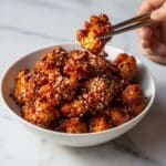 - Finish and Serve: Immediately after baking, toss the cauliflower florets in the warm sticky spicy sauce until evenly coated. Garnish with white sesame seeds and serve warm alongside rice or your preferred side dish.