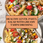 A vibrant and protein-packed Lentil Pasta Salad combining al dente fusilli pasta, nutty brown lentils, fresh vegetables, creamy feta, and a tangy tahini-lemon dressing. This easy-to-make salad is perfect for a wholesome lunch or a light dinner, offering a refreshing blend of textures and flavors with a Mediterranean twist.