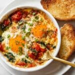Keywords: Mediterranean baked eggs, feta cheese eggs, baked eggs with tomatoes, easy breakfast recipe, vegetarian breakfast, Mediterranean recipe