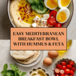 This Mediterranean Breakfast Bowl brings together the vibrant flavors of creamy hummus, tangy feta cheese, fresh vegetables, and perfectly boiled eggs, all drizzled with fragrant extra virgin olive oil and seasoned with oregano and Aleppo pepper. Served with warm pita bread, it’s a nutritious, colorful, and satisfying breakfast or brunch option inspired by Mediterranean cuisine.