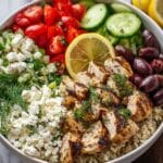 Mediterranean Lemon-Dill Chicken Bowls feature tender, marinated chicken served over a bed of fluffy quinoa or rice, complemented by fresh cucumber, tomatoes, red onion, Kalamata olives, and crumbled feta cheese. This vibrant and flavorful bowl combines zesty lemon, aromatic dill, and garlic for a healthy, fresh meal suitable for lunch or dinner.