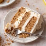 8. Assemble Cake: Place the first oatmeal cake layer on a cake stand. Spread 1 cup of vanilla frosting evenly on top. Repeat layers, alternating cake and frosting. Place the final cake layer upside down on top for a flat finish. Cover sides and top of the cake with a thin, even layer of frosting.