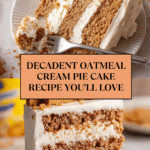 This Oatmeal Cream Pie Cake features moist layers of spiced oatmeal cake filled and frosted with rich vanilla buttercream. Finished with a smooth white chocolate glaze and decorated with crumbled oatmeal cream pie cookies, this cake blends cozy flavors and textures for a delightful dessert perfect for any occasion.