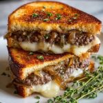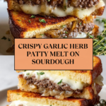 This Patty Melt on Garlic Herb Toasted Sourdough features juicy, seasoned ground beef patties topped with melted cheddar cheese and sweet caramelized onions, sandwiched between slices of buttery garlic herb sourdough bread. Perfectly toasted on the stovetop, this classic comfort sandwich combines rich flavors and a satisfying crunch for a delicious meal.