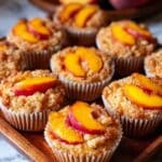 The image shows a wooden tray filled with nine peach muffins in white paper liners. Each muffin has a golden-brown crumbly top layer with a rough texture. On top, there are bright, fresh peach slices with a mix of orange and red hues, placed artfully on the center of each muffin. In the background, there is a blurred view of peaches on a white marbled surface, adding a fresh and inviting feel to the scene. The lighting highlights the warm colors and moist texture of the muffins. photo taken with an iphone --ar 4:5 --v 7