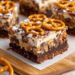 8. Add Pretzel Garnish and Chill: Immediately top baked bars with the reserved ½ cup mini pretzels, gently pressing them down. Let bars cool at room temperature for 30 minutes, then chill in the refrigerator for at least 1 hour to set.