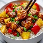 This Pineapple Chicken and Rice recipe delivers a delicious blend of tender chicken, sweet pineapple, and savory soy sauce all cooked together in a pan. It’s an easy stovetop meal that features a flavorful sauce thickened to a glossy finish, combined with colorful bell peppers and green onions for a fresh, vibrant dish perfect for any night of the week.